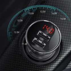 Inteligentna ładowarka samochodowa z wyświetlaczem napięcia ładowania. Kompaktowy gadżet wyposażony w 2 porty USB o łącznym prądzie wyjściowym 24W/4,8A.