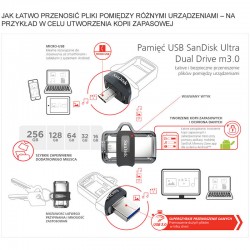 Pamięć SanDisk Ultra Dual Drive m3.0 ułatwia przenoszenie plików z telefonu na komputer. Dzięki wtykowi micro-USB z jednej strony i USB 3.0 z drugiej pamięć ta umożliwia łatwe przenoszenie plików pomiędzy wszystkimi urządzeniami, z jakich korzystasz.